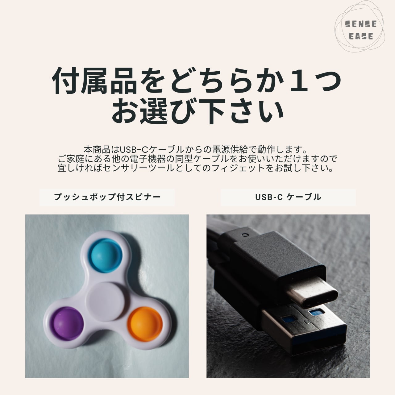 すでにUSB-Cケーブルをお持ちの場合は、センサリーツールとしてプッシュポップ付きスピナーをぜひお選びください。